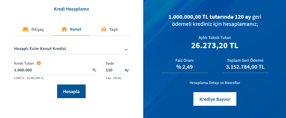 Aylık yüzde 2.99 faiz ve 120 ay vadeyle kullanılan 1 milyon TL konut kredisinde aylık ödeme yaklaşık 30 bin 798 TL oluyor. Toplam geri ödeme ise yaklaşık 3 milyon 695 bin TL'ye ulaşıyor.