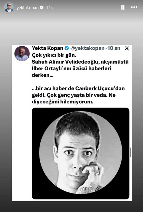 "Çok yıkıcı bir gün. Sabah Alinur Velidedeoğlu, akşamüstü İlber Ortaylı'nın üzücü haberleri derken… Bir acı haber de Canberk Uçucu'dan geldi. Çok genç yaşta bir veda. Ne diyeceğimi bilemiyorum."