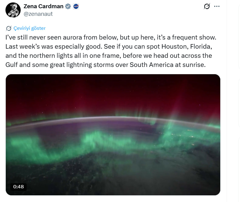 Cardman yalnızca auroranın oluşturduğu renk cümbüşüne odaklanmakla kalmadı; aynı kare içine sığan diğer detayları da vurguladı. Paylaşımında, Houston ve Florida kıyılarının aynı anda görülebildiğini, ardından istasyonun Güney Amerika üzerindeki şimşek fırtınalarının eşlik ettiği bir gün doğumuna ilerlediğini belirtti.