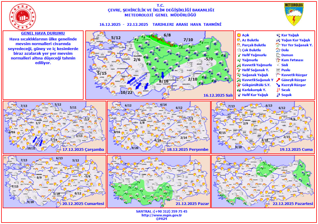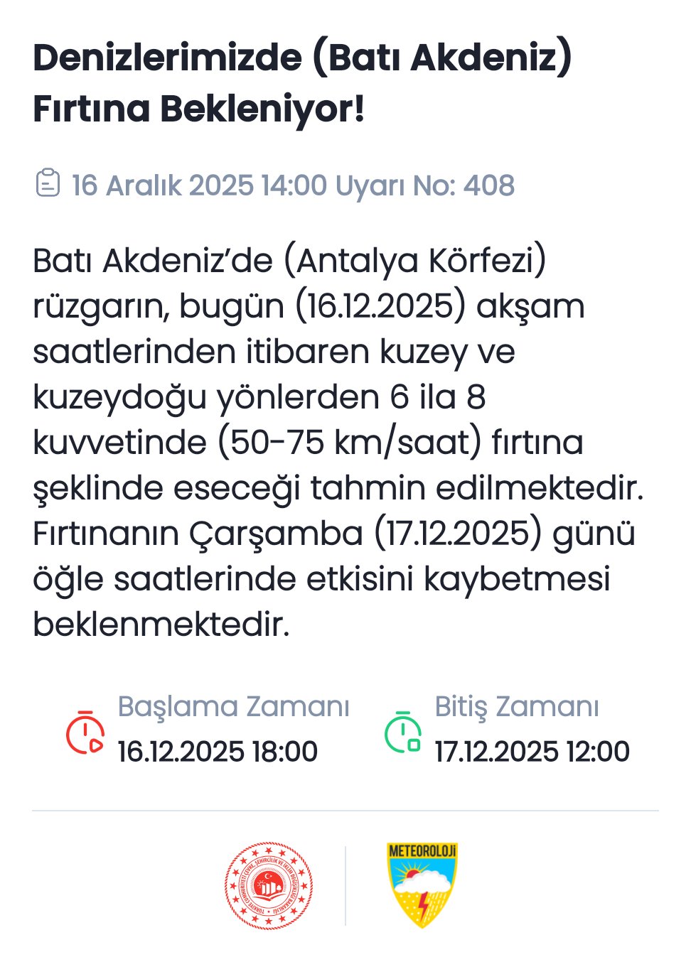 "Batı Akdeniz'de (Antalya Körfezi) rüzgarın, bugün (16.12.2025) akşam saatlerinden itibaren kuzey ve kuzeydoğu yönlerden 6 ila 8 kuvvetinde (50-75 km/saat) fırtına şeklinde eseceği tahmin edilmektedir. Fırtınanın Çarşamba (17.12.2025) günü öğle saatlerinde etkisini kaybetmesi beklenmektedir."