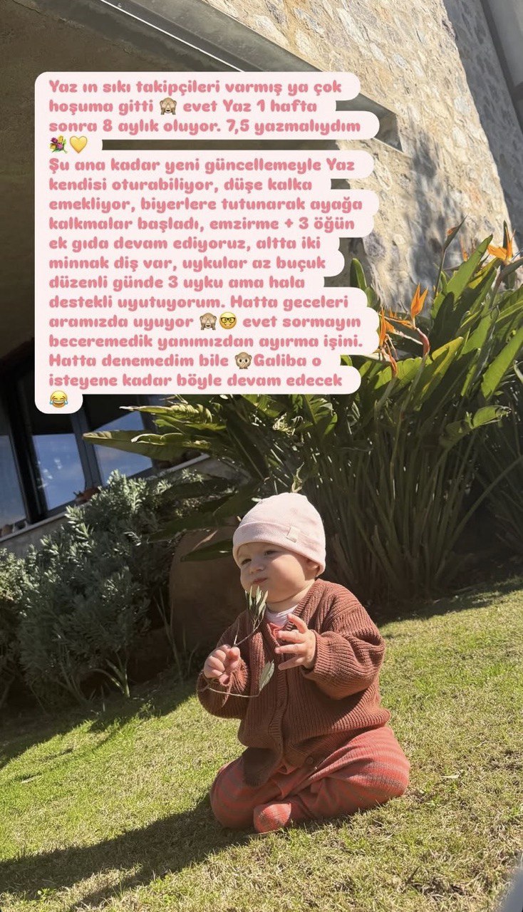 ''Yaz'ın sıkı takipçileri varmış ya çok hoşuma gitti. Evet Yaz 1 hafta sonra 8 aylık oluyor. 7,5 yazmalıydım. Şu ana kadar yeni güncellemeyle Yaz kendisi oturabiliyor, düşe kalka emekliyor, bir yerlere tutunarak ayağa kalkmalar başladı. Emzirme + 3 öğün ek gıda devam ediyoruz. Altta iki minnak diş var, uykular az buçuk düzenli günde 3 uyku ama hala destekli uyutuyorum. Hatta geceleri aramızda uyuyor. Evet sormayın, beceremedik yanımızdan ayırma işini. Hatta denemedim bile galiba o isteyene kadar böyle devam edecek''