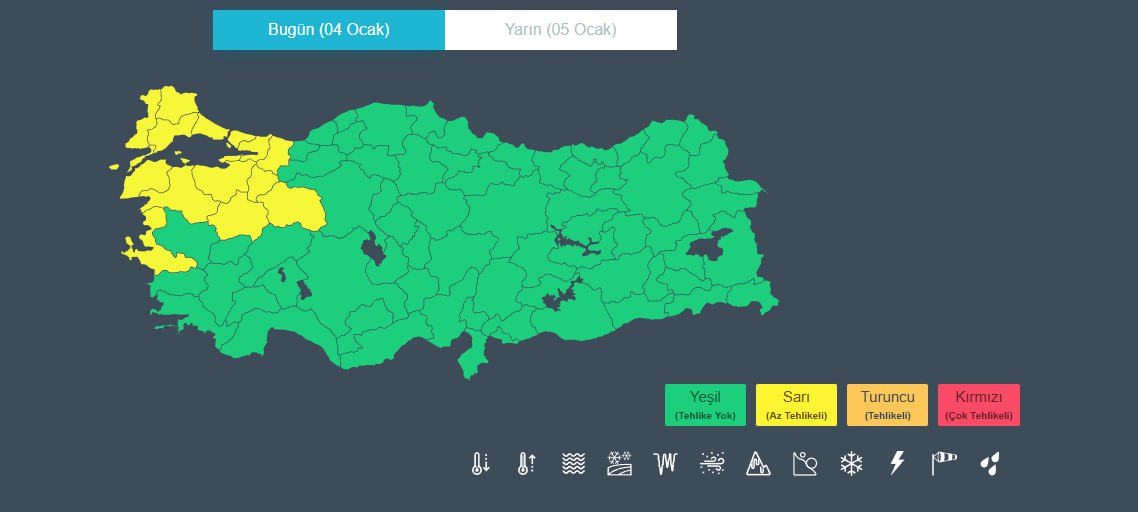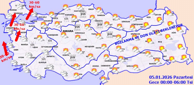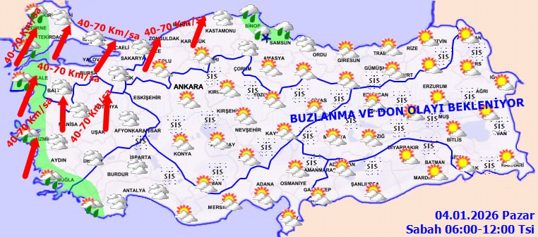 Sabah ve gece saatlerinde iç ve doğu kesimlerde buzlanma ve don olaylarıyla birlikte pus ve yer yer sis beklenirken, Doğu Karadeniz'in yüksekleri ile Doğu Anadolu'nun doğusunda yüksek kar örtüsüne sahip eğimli alanlarda çığ riski bulunuyor.