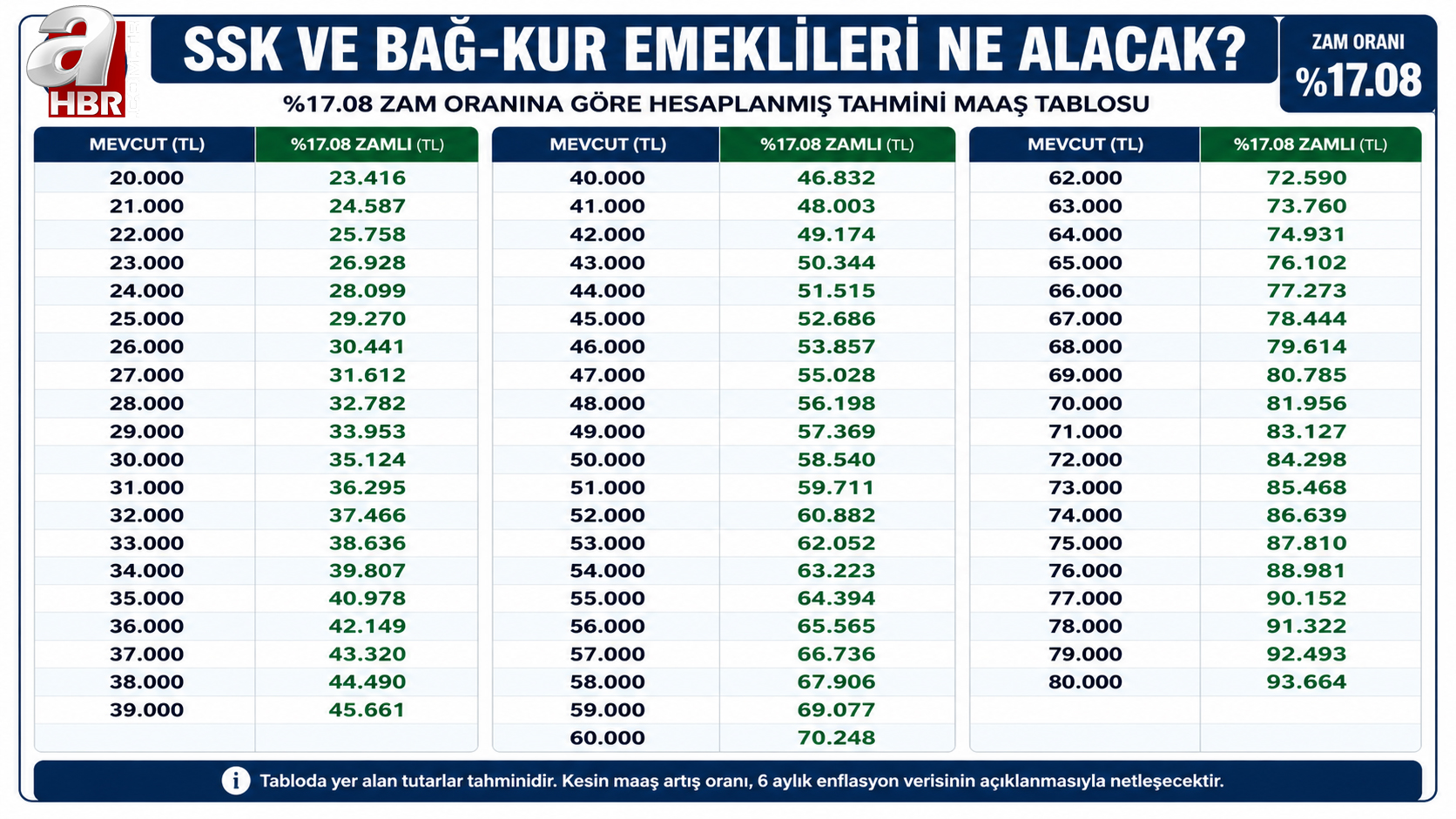 Bu tahminlerin gerçekleşmesi halinde 6 aylık enflasyonun yüzde 17,08'e ulaşması bekleniyor. Bu oran, doğrudan SSK ve Bağ-Kur emeklilerinin zam oranını oluşturacak.