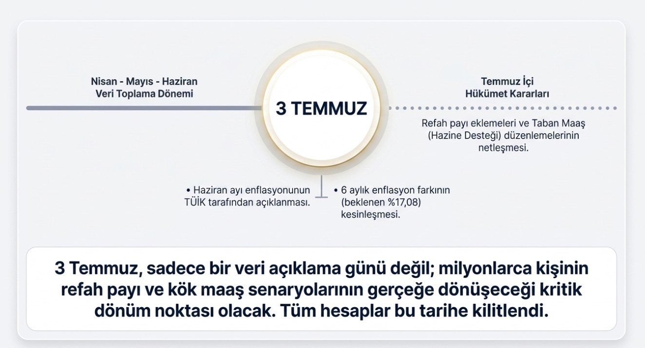 Zam oranlarının kesinleşmesi için Haziran ayı enflasyon verisinin açıklanması bekleniyor. 3 Temmuz'da duyurulacak veriyle birlikte 6 aylık enflasyon netleşecek ve maaş artışları kesinlik kazanacak.