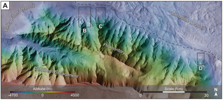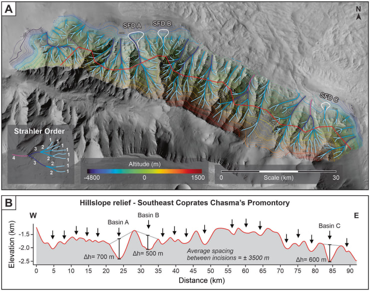 Bilim insanları, ESA ve NASA'nın Mars yörünge araçlarından alınan yüksek çözünürlüklü görüntülerle Valles Marineris içindeki Coprates Chasma bölgesini inceledi. Analizlerde, nehirlerin denize döküldüğü alanlarda oluşan yelpaze deltalarına benzer tortul yapılar belirlendi. Bulgular, Mars'ın yaklaşık 3,37 milyar yıl önce geniş bir kıyı şeridine sahip olabileceğine işaret etti.