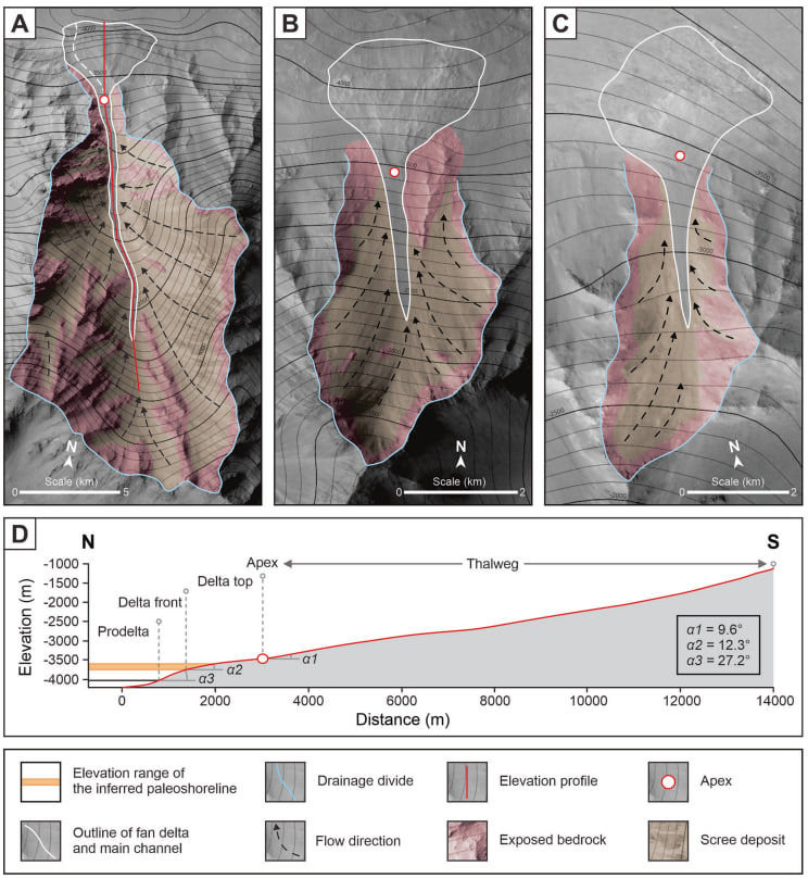Yeni araştırma, Mars'ta bir zamanlar Dünya'daki Arktik Okyanusu kadar büyük bir okyanus bulunmuş olabileceğini ortaya koydu. Coprates Chasma'da tespit edilen yelpaze deltalar, su seviyesinin 3.650-3.750 metre bandına ulaştığını gösteriyor.