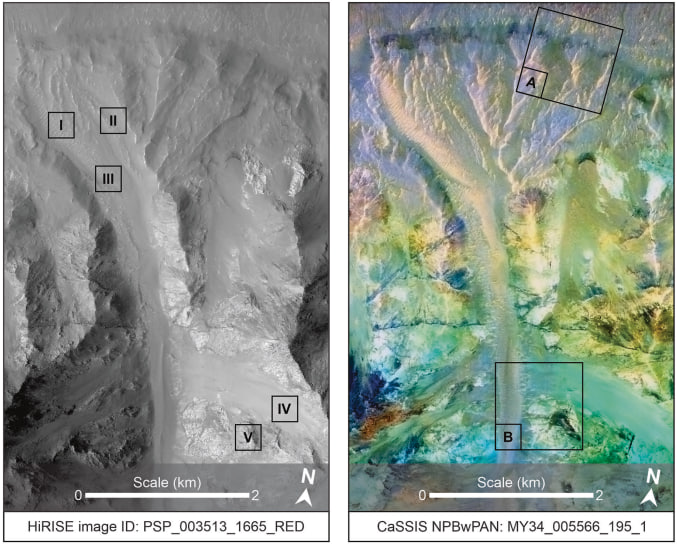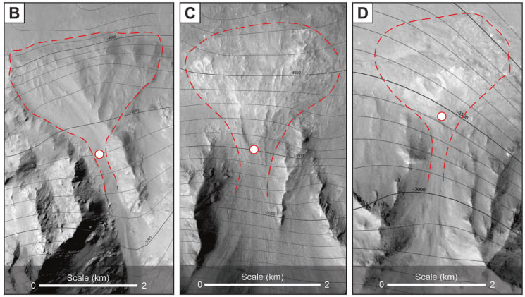 İnceleme alanı, Valles Marineris'in bir parçası olan Coprates Chasma'nın güneydoğu kesimi oldu. Burada görülen dik yamaçlı tortulların, Dünya'daki yelpaze deltalarına benzer şekilde oluştuğu belirtildi. Bu tür yapılar, akarsuların büyük su kütlelerine döküldüğü bölgelerde oluşuyor.