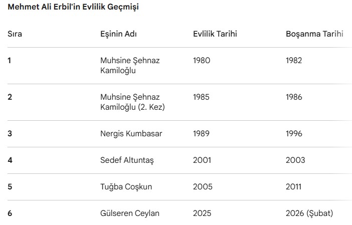 Ünlü şovmen Mehmet Ali Erbil ile kendisinden 42 yaş küçük eşi Gülseren Ceylan, yaklaşık 7 ay süren evliliklerini noktaladı. Çift, Beykoz 1. Aile Mahkemesi'nde görülen davada "evlilik birliğinin temelden sarsılması" gerekçesiyle tek celsede boşandı.