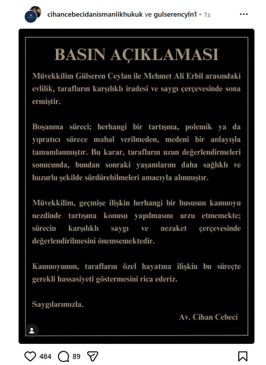 "Müvekkilim Gülseren Ceylan ile Mehmet Ali Erbil arasındaki evlilik, tarafların karşılıklı iradesi ve saygı çerçevesinde sona ermiştir. Boşanma süreci; herhangi bir tartışma, polemik ya da yıpratıcı sürece mahal verilmeden, medeni bir anlayışla tamamlanmıştır. Bu karar, tarafların uzun değerlendirmeleri sonucunda, bundan sonraki yaşamlarını daha sağlıklı ve huzurlu şekilde sürdürebilmeleri amacıyla alınmıştır.