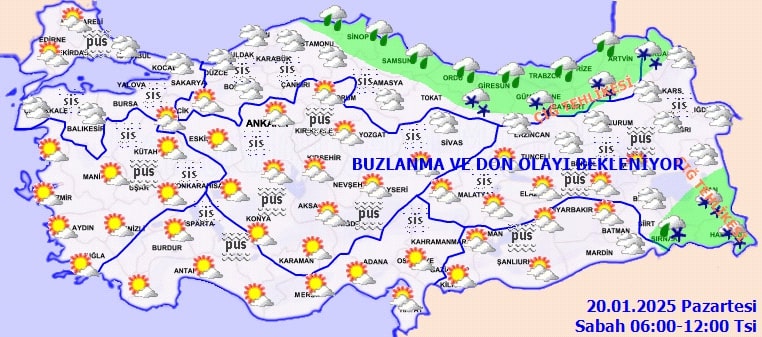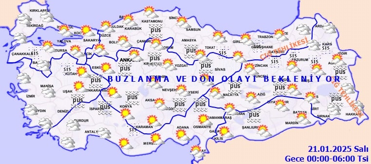 Özellikle ülkemizin iç ve doğu kesimlerinde buzlanma ve don olayı görülebilir. Ayrıca, yer yer sis ve pus bekleniyor. Ulaşımda aksamalar yaşanmaması için sürücüler başta olmak üzere herkesin dikkatli olması gerektiği vurgulanıyor.