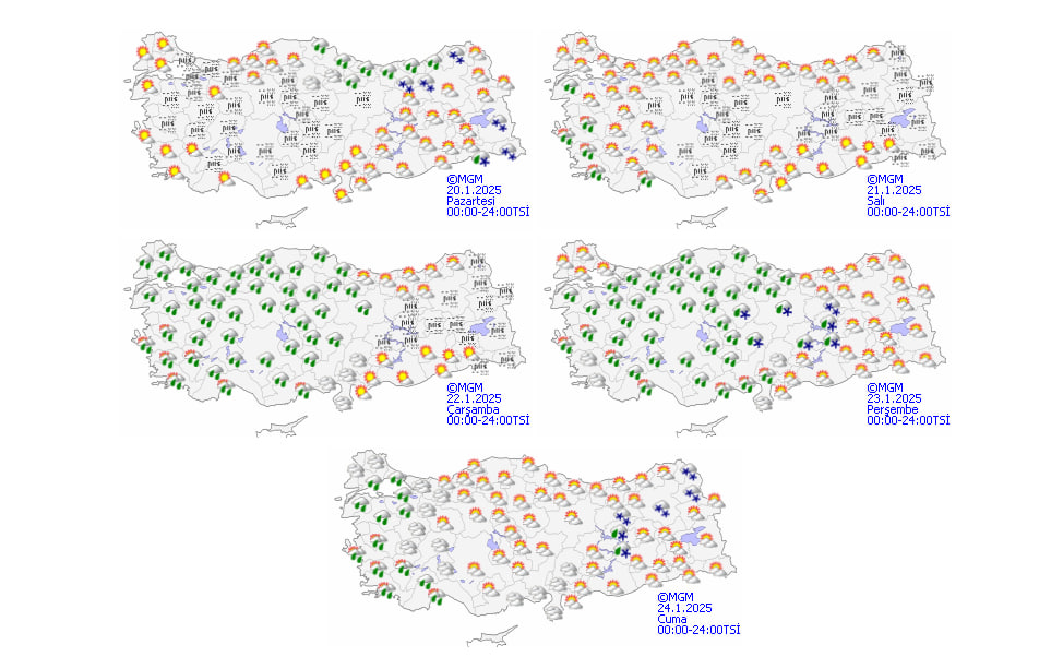 Meteoroloji Genel Müdürlüğü'nün son tahminlerine göre, ülkemizin kuzey, doğu ve batı kesimlerinde parçalı ve çok bulutlu bir hava hakim olacak. Orta ve Doğu Karadeniz kıyıları, Sinop, Gümüşhane, Bayburt, Ardahan, Hakkari, Şırnak, Van çevreleri ile Kastamonu kıyılarında yağış bekleniyor. Yağışlar, kıyı bölgelerde yağmur, iç kesimlerde ise karla karışık yağmur ve kar şeklinde olacak. Diğer bölgelerin az bulutlu ve açık geçeceği tahmin ediliyor.