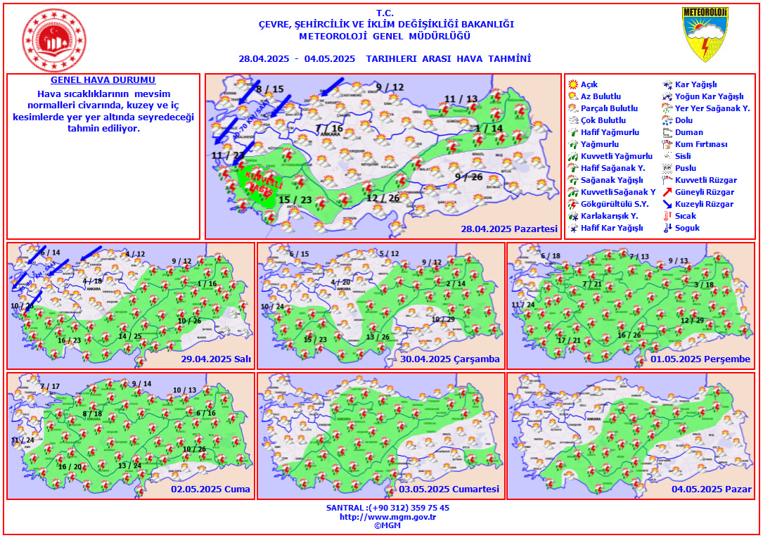 Meteoroloji Genel Müdürlüğü'nün son tahminlerine göre, Türkiye genelinde parçalı ve çok bulutlu bir hava bekleniyor. Ülkenin bazı bölgelerinde, özellikle Ege, Akdeniz'in iç kesimleri, Doğu Karadeniz kıyıları, Doğu Anadolu'nun kuzeyi ve Karaman çevrelerinde aralıklı sağanak ve gök gürültülü sağanak yağışlar görülecek.