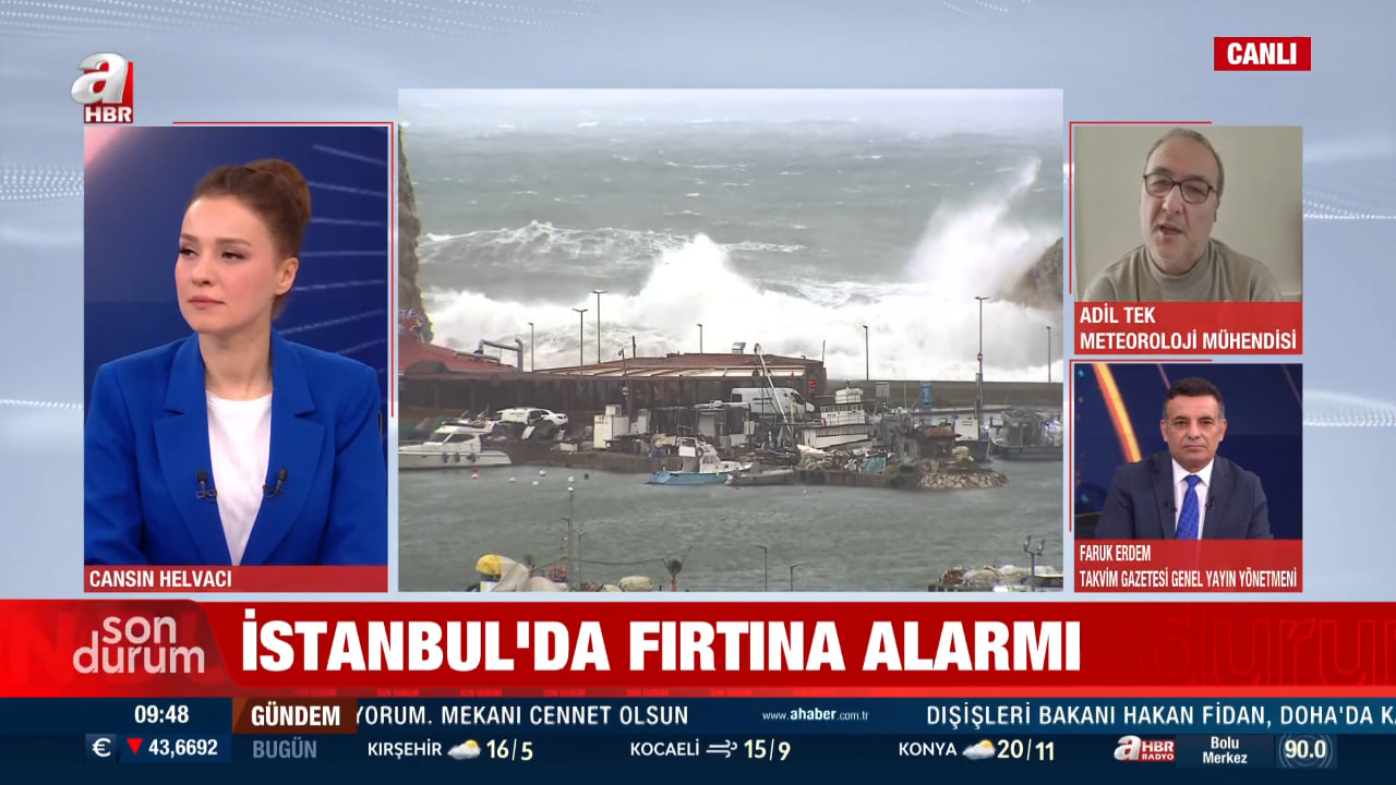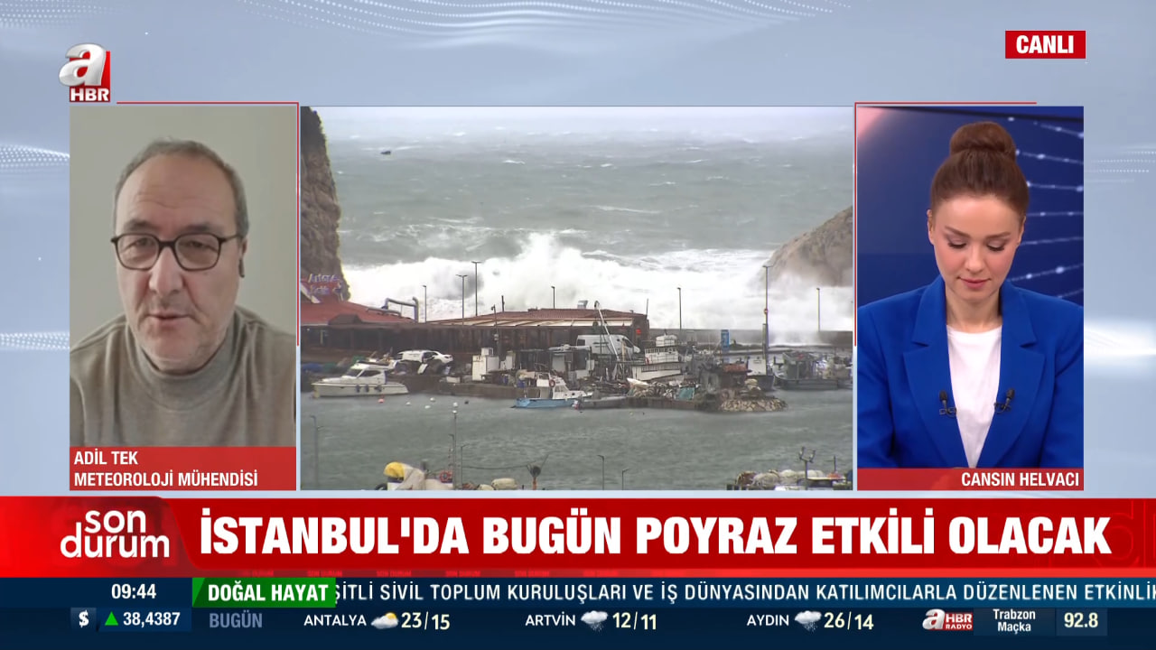 A Haber canlı yayınında meteoroloji mühendisi Adil Tek, İstanbul ve çevresindeki rüzgar durumu ve olası fırtına etkileri hakkında açıklamalarda bulundu. Tek şu anda bölgede etkili olan rüzgarın hamleli olduğunu ve bazı yüksek bölgelerde fırtına sınırlarını aşan hızlara ulaşmaya başladığını söyledi. Özellikle Aidos'taki Meteoroloji Genel Müdürlüğü istasyonunda saatte 67 kilometre hıza kadar çıkan rüzgarın, fırtına sınırlarının üzerinde olduğunu ifade etti.