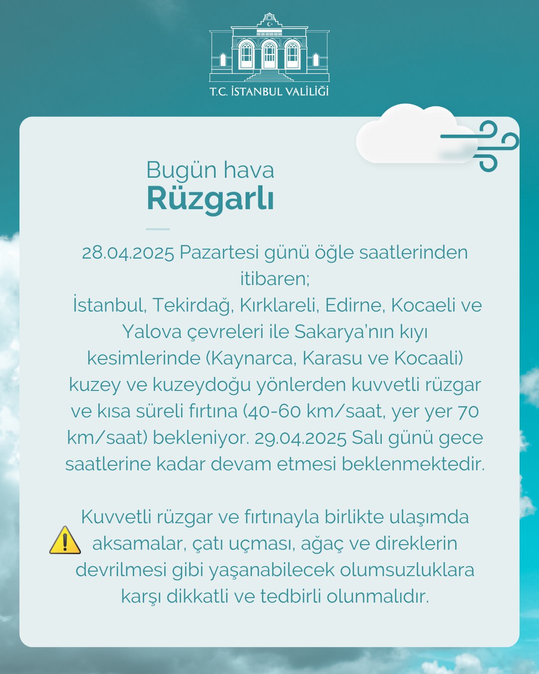 Adil Tek, öğleden sonra rüzgarın hızının biraz daha artacağını ve akşam saatlerinde fırtınanın şiddetinin zaman zaman 70 kilometreye kadar çıkabileceğini vurguladı. "Bu durum özellikle İstanbul ve çevresindeki bölgelerde etkili olacak. Yüksek bölgelerde ise daha kuvvetli rüzgarlar görülebilir" dedi.