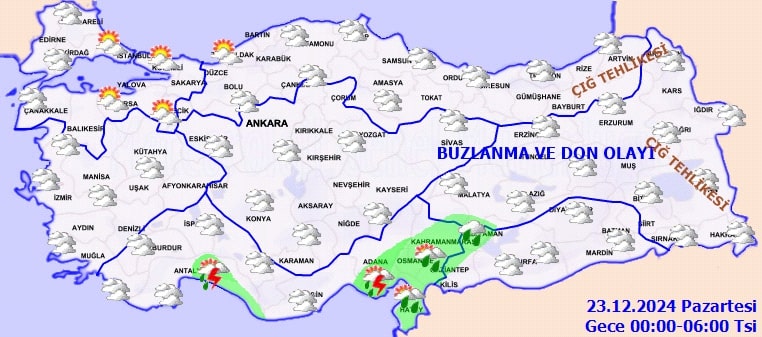 Özellikle iç ve doğu kesimlerde buzlanma ve don olaylarına karşı dikkatli olunması gerekiyor. Ayrıca, bu bölgelerde pus ve yer yer yoğun sis hadisesi görülebilir. Ulaşımda aksamalara yol açabilecek bu durum için sürücüler uyarıldı.