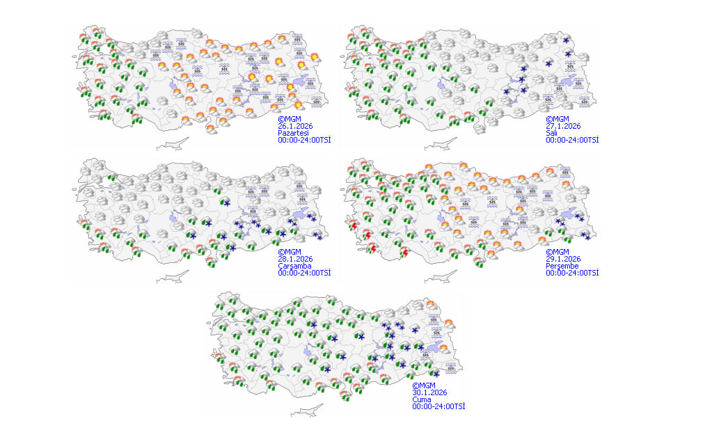 Meteoroloji Genel Müdürlüğü'nün son değerlendirmelerine göre Türkiye'nin kuzey, iç ve batı kesimlerinde hava yer yer çok bulutlu olacak. Marmara, Ege ve Batı Akdeniz bölgeleri ile Eskişehir, Düzce, Zonguldak ve Karabük çevrelerinde yağmur ve sağanak, yer yer gök gürültülü sağanak yağış bekleniyor.
