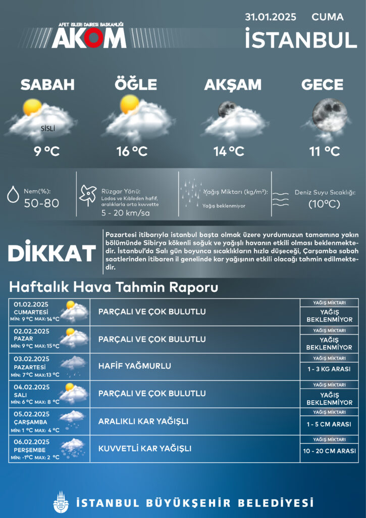 AKOM raporlarına göre, 5 Şubat Çarşamba günü İstanbul'da kar yağışı etkisini göstermeye başlayacak. 6 Şubat Perşembe günü kuvvetli kar yağışı bekleniyor. Hava sıcaklıklarının ani düşüşü ile birlikte İstanbul ve çevresinde buzlanma ve don olayları yaşanabilir. Yetkililer, vatandaşlara tedbirli olmaları çağrısında bulundu.