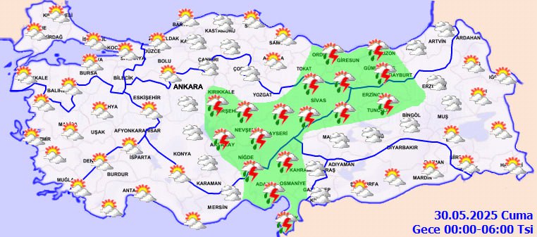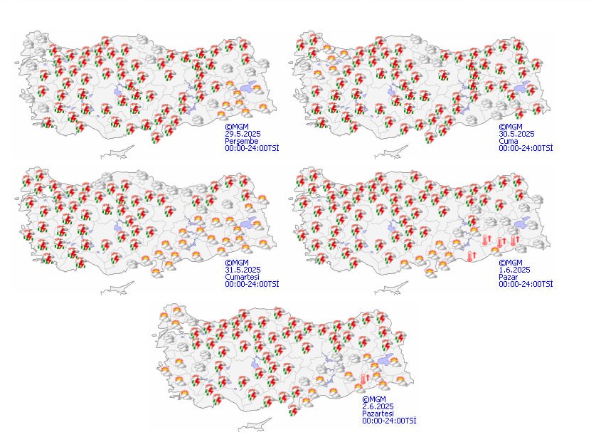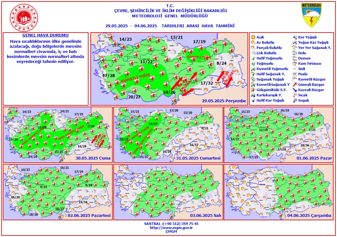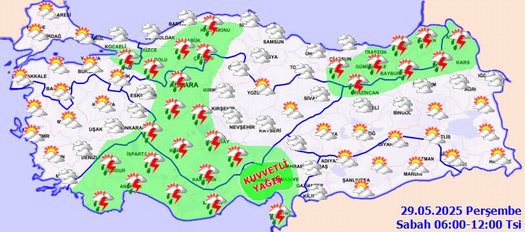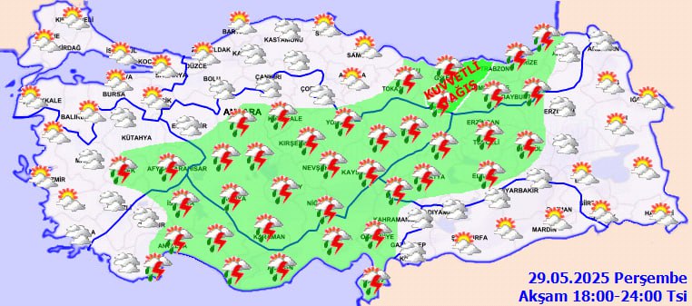 Meteoroloji bugün yurt genelinde parçalı bulutlu havayla birlikte özellikle İç Anadolu ve Akdeniz'de kuvvetli sağanak ve gök gürültülü yağışlar bekliyor. Kırklareli, Adıyaman, Gaziantep gibi illerde yağış geçişleri öngörülürken, ani su baskını ve dolu riskine karşı dikkatli olunması istendi. Sıcaklıklar mevsim normallerine dönerken rüzgar zaman zaman kuvvetlenecek.