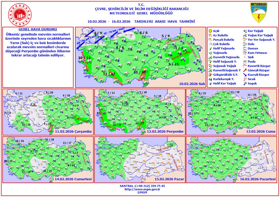 Meteoroloji Uzmanı Adil Tek, 10 Şubat Salı günü yaptığı son değerlendirmelerde İstanbul'da rüzgârın saatler içinde zayıflayacağını, Doğu Anadolu'da kar yağışının sürdüğünü ve özellikle perşembe ile cuma günleri Ege ve Akdeniz'de çok kuvvetli yağış beklendiğini açıkladı.