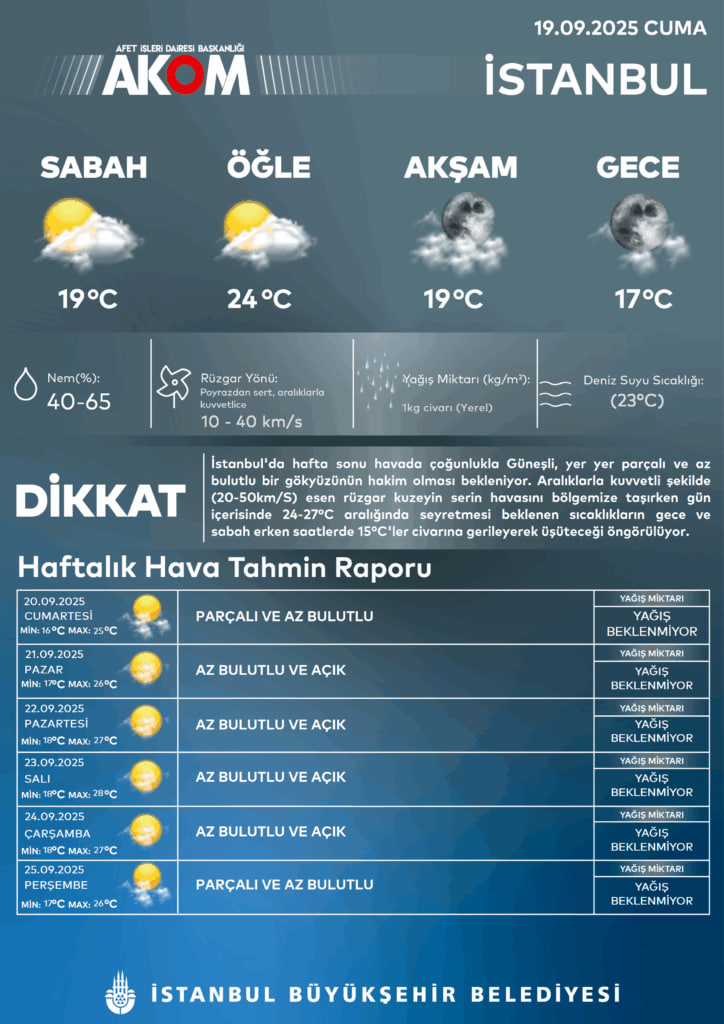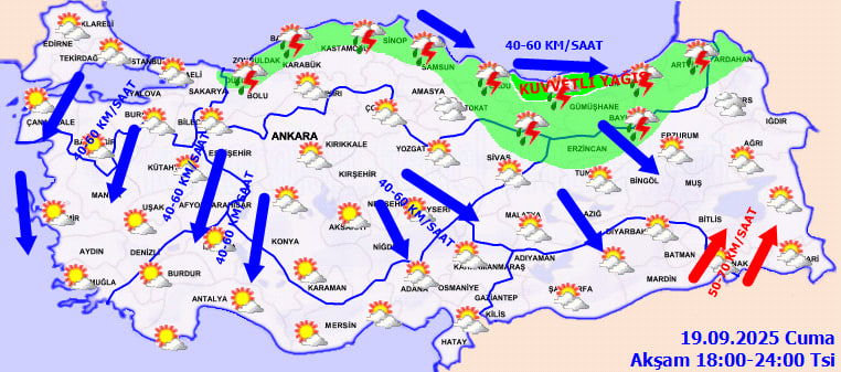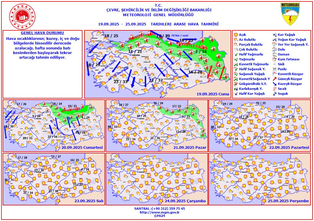 Meteoroloji Genel Müdürlüğü (MGM), Türkiye'nin kuzey, iç ve doğu kesimlerinde parçalı ve çok bulutlu havanın hakim olacağını, bazı bölgelerde ise sağanak ve gök gürültülü sağanak yağışların etkili olacağını açıkladı. Özellikle Karadeniz kıyılarında, Doğu Anadolu'nun kuzeydoğusunda ve Artvin çevresinde kuvvetli yağış bekleniyor. Yetkililer, ani sel, su baskını, yıldırım ve fırtına gibi olumsuzluklara karşı vatandaşları uyardı.
