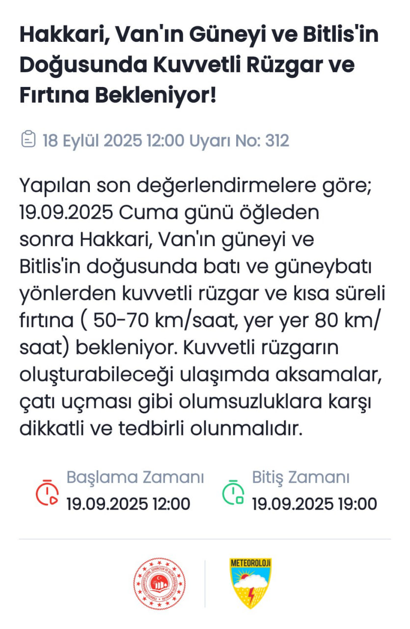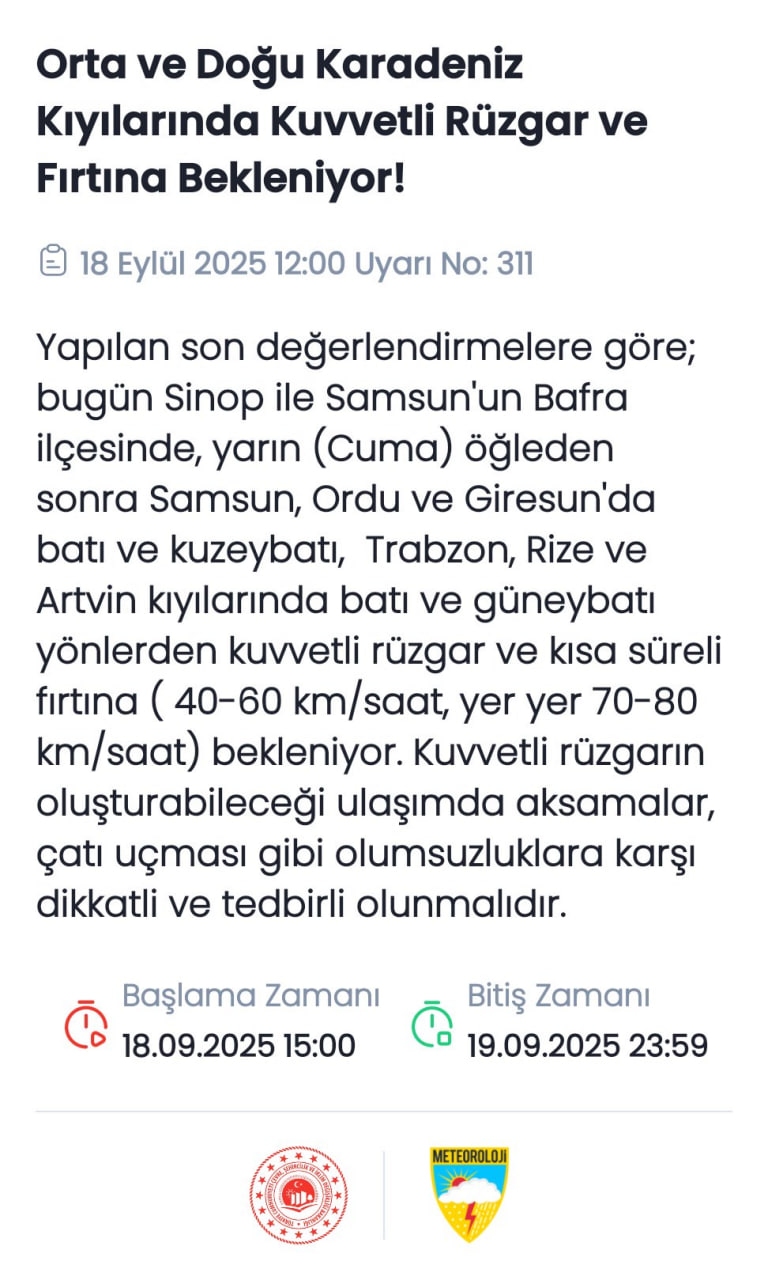 "Cumartesi gününün haritasına bakıldığında Orta ve Doğu Karadeniz'in kıyı kesimleri ve Doğu Anadolu'nun kuzeyinde yağışları görmek mümkün olacak. Özellikle yağışlar Giresun, Trabzon, Rize ve Artvin çevrelerinde kuvvetli yer yer çok kuvvetli olacak. Yarın yani cumartesi günü akşam saatlerine kadar geçerliliğini koruyor. Buradaki vatandaşlarımızın ani sel, su baskını, yıldırım, yağış anında kuvvetli rüzgar ve ulaşımda aksamalara karşı dikkat ve tedbirli olmalarını istemekteyiz. Pazar gününe bakıldığında pazar gününde yine ülkemizin kuzeydoğu kesimlerinde yağışları göreceğiz. Sinop'tan Artvin hattı boyunca ve Ardahan'dan Hakkari hattı boyunca yağışları yağışları görmek mümkün olacak. Yine yağışlar yer yer doğu kesimlerde kuvvetli olabilir. Diğer yerler ise az bulutlu ve açık geçecek."