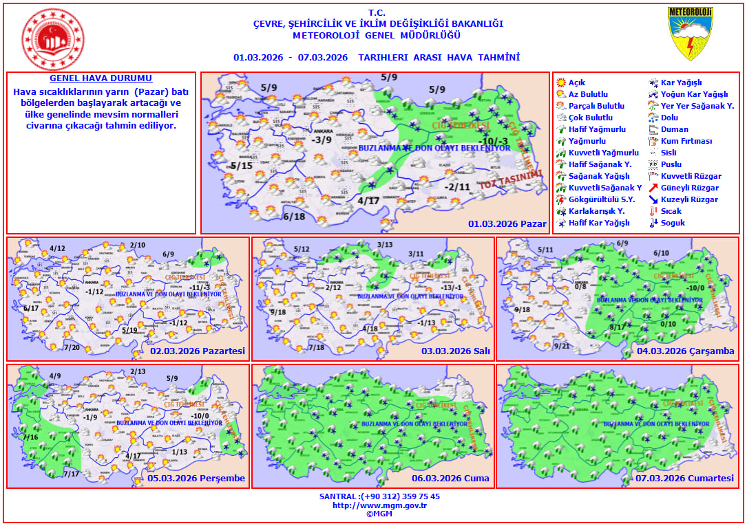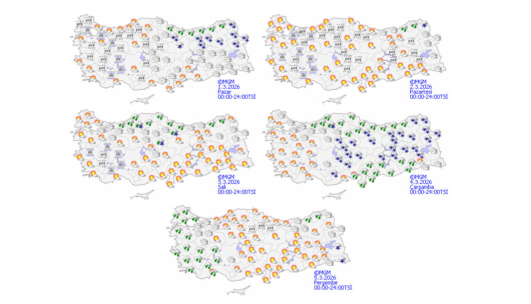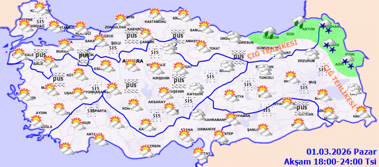 Meteoroloji Genel Müdürlüğü'nün son değerlendirmelerine göre bugün Türkiye genelinde kuzey, iç ve doğu kesimlerde bulutlu hava etkili olacak; Orta ve Doğu Karadeniz kıyılarında yağmur, Doğu Karadeniz'in içi ile Doğu Anadolu'nun kuzeydoğusunda ve bazı İç Anadolu illerinde karla karışık yağmur ve kar görülecek. Batıda sıcaklık 1 ila 3 derece artarken, iç ve doğu bölgelerde buzlanma, sis ve yüksek kesimlerde çığ riski bekleniyor.