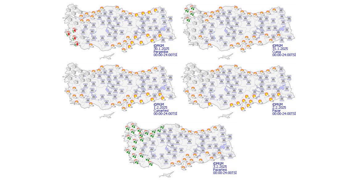 Meteoroloji Genel Müdürlüğü'nün son tahminlerine göre, ülkenin batı kesimlerinde yer yer çok bulutlu bir hava hakim olacak. Öğle saatlerinden itibaren Ege'nin kıyı kesimlerinde sağanak yağış beklenirken, diğer bölgelerde parçalı ve az bulutlu bir hava öngörülüyor.