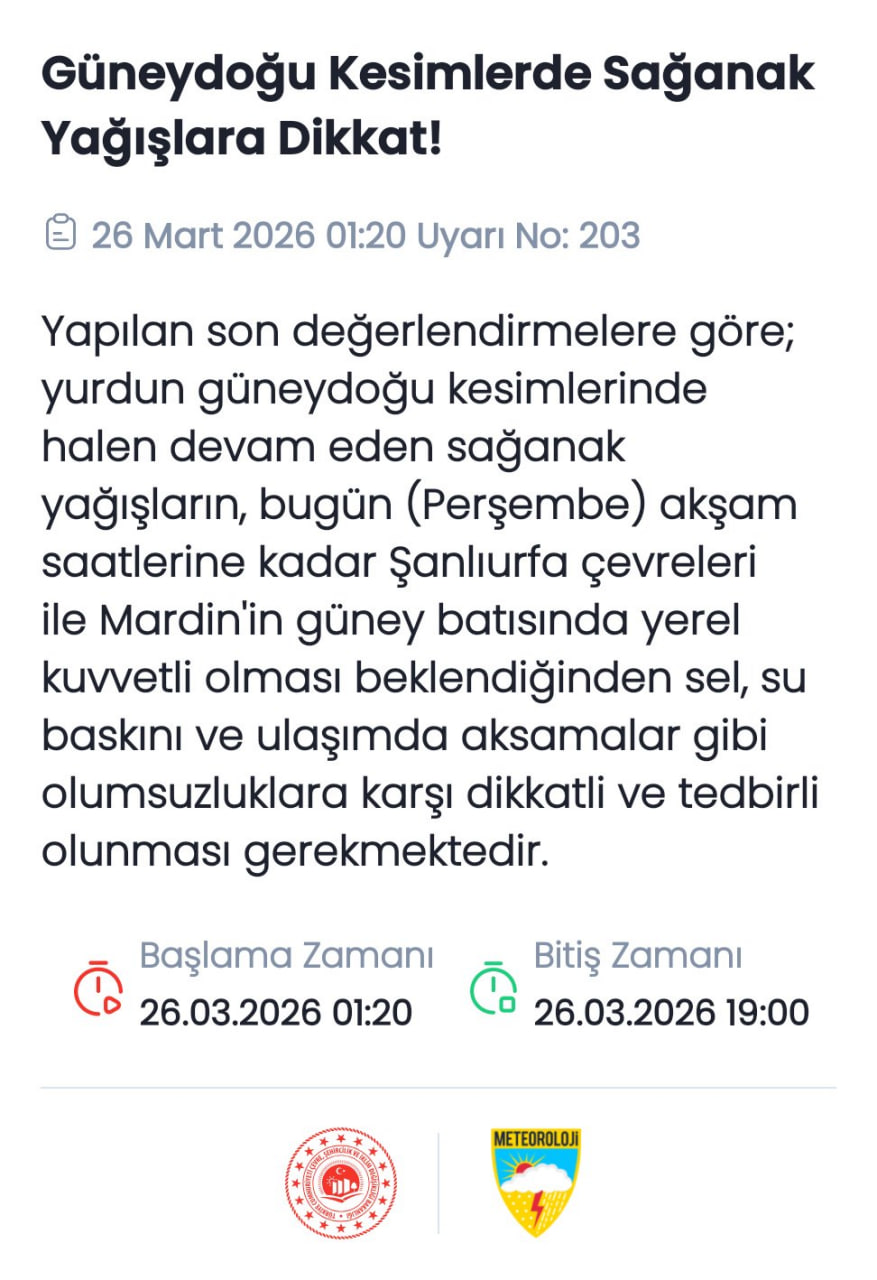 Meteoroloji Genel Müdürlüğü'nün 26 Mart tarihli raporuna göre, bugün ülke genelinde hava parçalı ve çok bulutlu seyredecek. Mardin ve Şanlıurfa için sarı kodlu uyarı verildi. Akşam saatlerine kadar etkisini sürdürecek kuvvetli sağanak yağışların; sel, su baskını ve ulaşımda aksamalara yol açma riski bulunuyor. İşte bölge bölge hava durumu detayları….