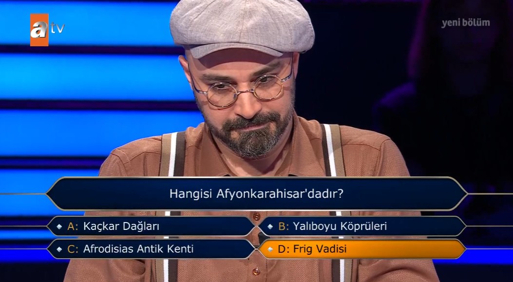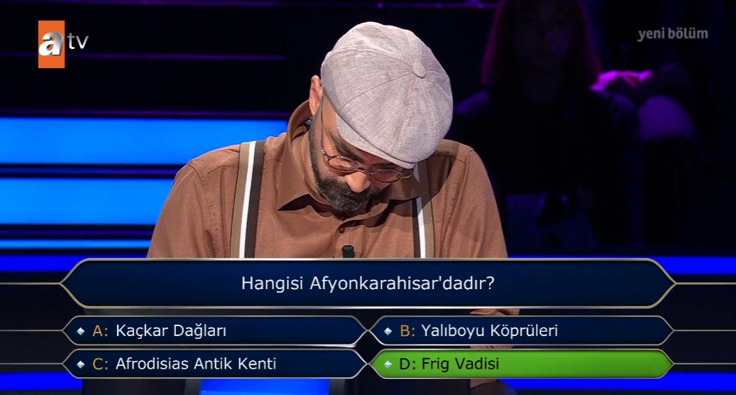 Aslan ikinci jokerini kullanmasının ardından b ve d şıkları elenirken diğer iki şık arasında uzun bir süre düşünerek yanıtını verdi. Aslan ani bir kararla D şıkkı 1,754 yanıtını verdi.