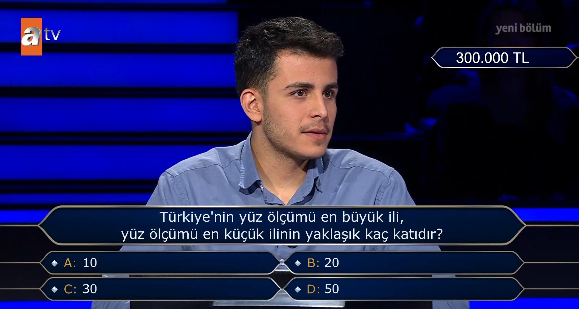 Sami Yusuf Demir, Milyoner'de 300 bin lira değerindeki "Türkiye'nin yüz ölçümü en büyük ili, yüz ölçümü en küçük ilinin yaklaşık kaç katıdır?" oldukça zorlanarak doğru yanıtı bulmak için epey uğraştı.