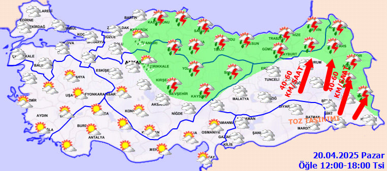 Yurdun büyük bölümünde rüzgar güney yönlerden hafif ve zaman zaman orta kuvvette esecek. Ancak Doğu Anadolu'nun doğusunda rüzgarın güney ve güneybatıdan kuvvetli (40-60 km/saat) esmesi bekleniyor. Bu durum, çatı uçması, ağaç devrilmesi gibi olumsuzluklara yol açabileceği için vatandaşların dikkatli ve tedbirli olması gerekiyor.