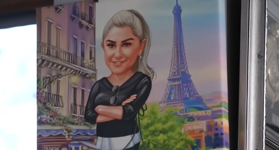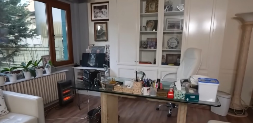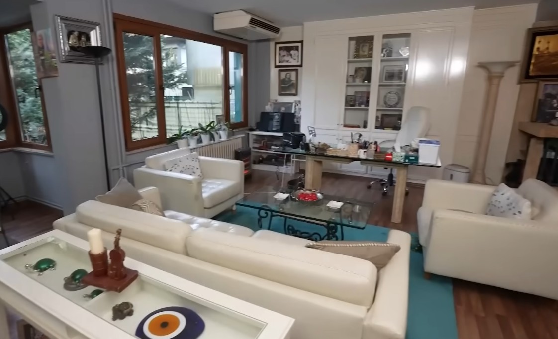 Dolaplar, ocak ve masa düzenli yapısıyla dikkat çekerken; beyaz rengin ön planda olduğu salonda ise tablolar, fotoğraflar ve çerçeveler hemen göze çarpıyor.
