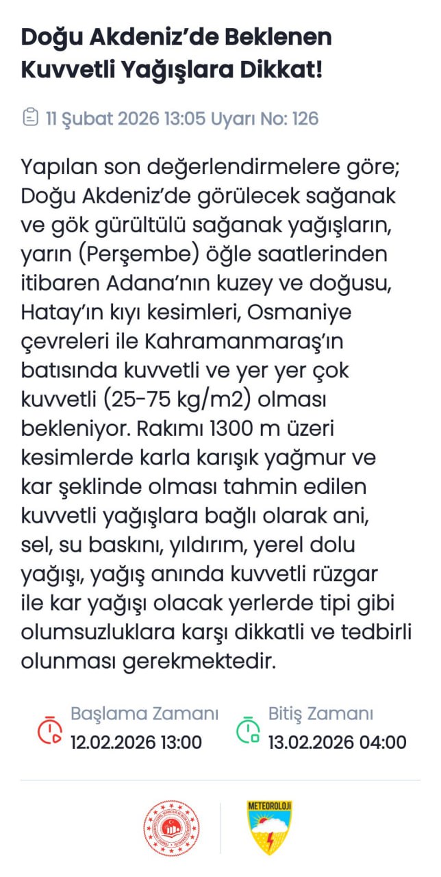 Gaziantep, Osmaniye ve Kahramanmaraş çevresinde yerel olarak yoğun yağış görüldüğünü belirten Tek, Hatay'a dikkat çekti. "Özellikle akşam ve gece saatleri Hatay'da çok yoğun, kuvvetli yağış var. Buralarda sel ve su baskını riski bulunuyor." diyen Tek, Hatay-Osmaniye-Adana hattında kuvvetli yağış beklendiğini vurguladı.
