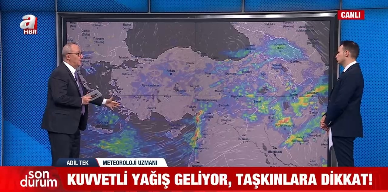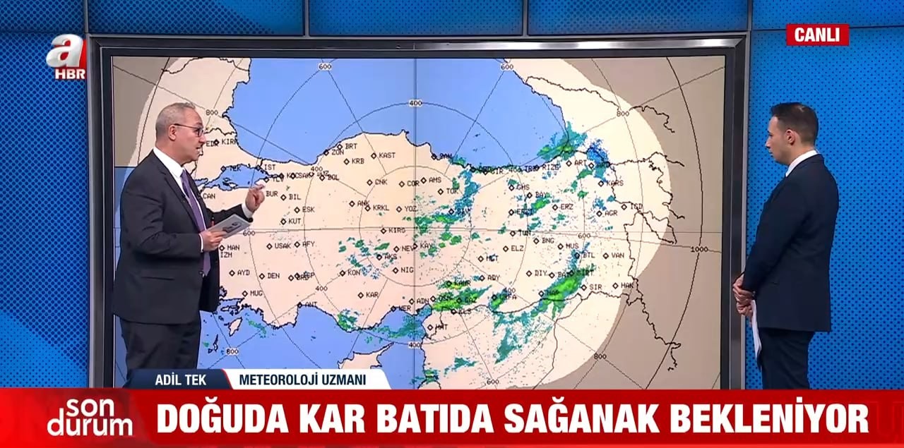 A Haber canlı yayınında değerlendirmelerde bulunan meteoroloji uzmanı Adil Tek, yağışlı sistemin batıdan doğuya doğru ilerlediğini belirtti. Yurdun orta ve doğu kesimlerinde yağışların devam ettiğini ettiğini vurgulayarak Doğu Anadolu'da kar yağışlarının özellikle yüksek kesimlerde etkili olduğunu söyledi. "O dondurucu soğuklar yok ama beraberinde yağış etkili oluyor." dedi.