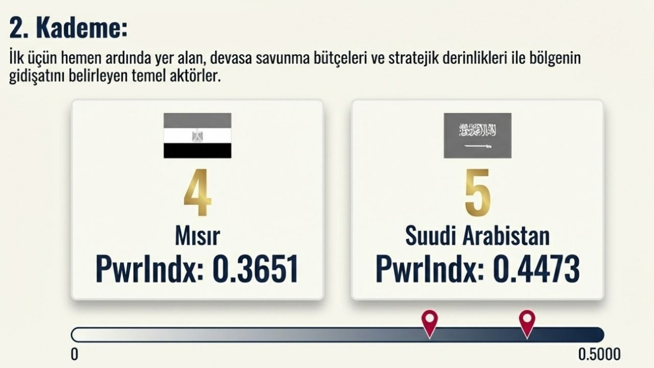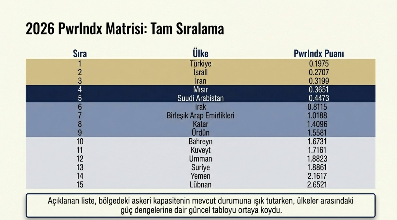 Orta Doğu'daki askeri dengelere ilişkin hazırlanan son güç endeksi kamuoyuna açıklandı. "PwrIndx" (Power Index) verilerine dayanan sıralamada; insan gücü, savunma bütçesi, askeri envanter, lojistik kapasite ve stratejik unsurlar dikkate alındı. Endekste puanın sıfıra yaklaşması, ilgili ülkenin askeri kapasitesinin göreceli olarak daha güçlü olduğu anlamına geliyor.