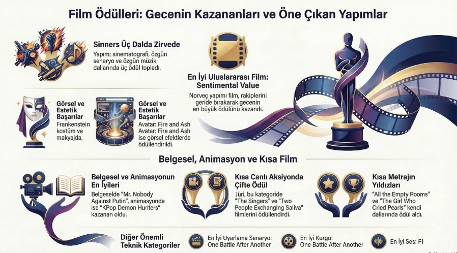 Bu yılın Oscar törenine altı ödülle "Savaş Üstüne Savaş" (One Battle After Another) damga vurdu. Film; En İyi Film, En İyi Yönetmen ve En İyi Uyarlama Senaryo dahil birçok önemli kategoride ödül kazandı. Gecenin dikkat çeken anlarından biri ise En İyi Yardımcı Erkek Oyuncu ödülünü kazanan Sean Penn'in törene katılmaması oldu. Ünlü oyuncu böylece kariyerindeki üçüncü Oscar'ını sahneye çıkmadan kazanmış oldu.