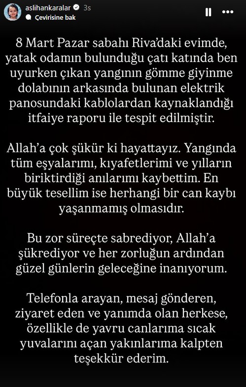 Hayatta oldukları için şükreden Aslıhan Karalar, "Yangında tüm eşyalarımı, kıyafetlerimi ve yılların biriktirdiği anılarımı kaybettim. En büyük tesellim ise herhangi bir can kaybı yaşanmamış olmasıdır" ifadelerini kullandı.