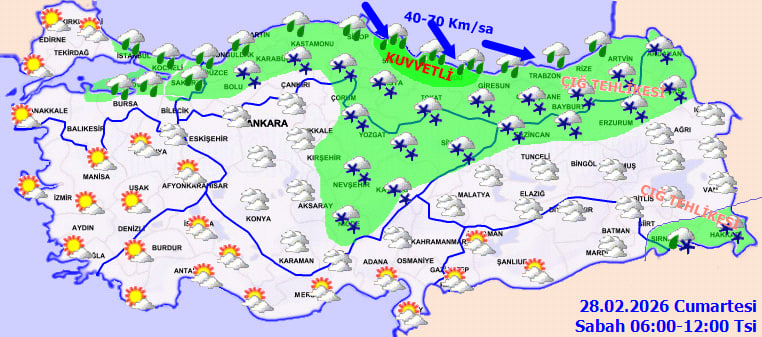 Meteoroloji Genel Müdürlüğü, kuzey, iç ve doğu kesimler için kar ve karla karışık yağmur uyarısı yaptı. Samsun ve Ordu'da sabah saatlerinde kuvvetli yağış beklenirken, Orta ve Doğu Karadeniz kıyılarında 70 km/saat hızla fırtına görülebileceği bildirildi.