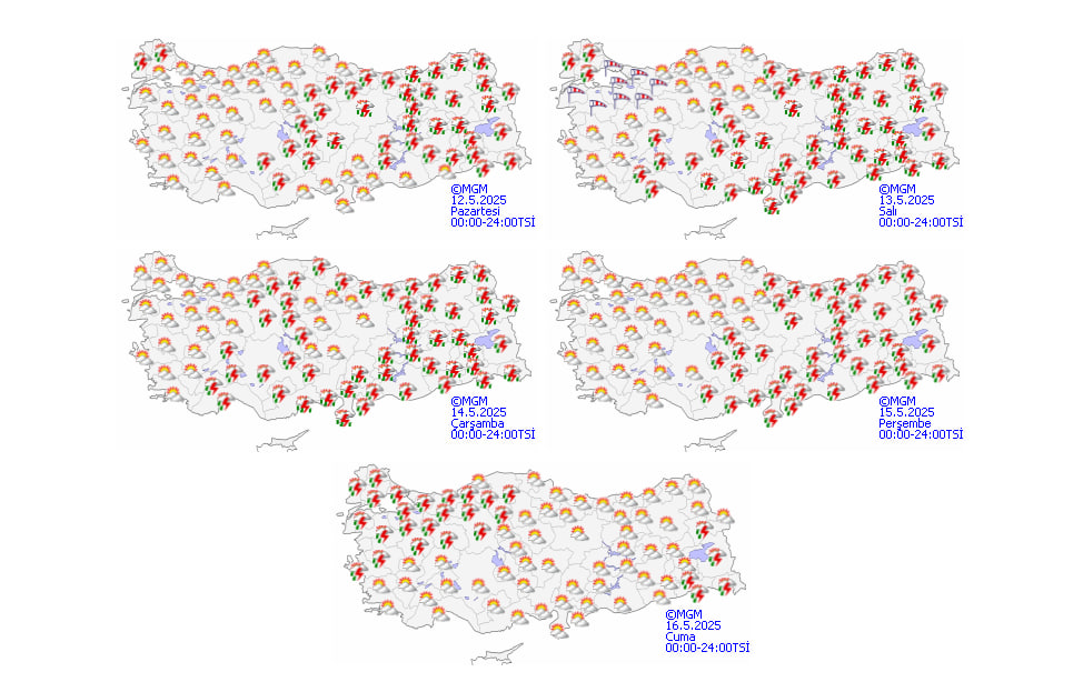 Yeni haftayla birlikte Türkiye genelinde sağanak ve yer yer gök gürültülü sağanak yağışlar etkili olacak. Özellikle kuzey, doğu ve iç kesimlerde yağışların şiddeti artacak. Hafta başından itibaren, Adana, Mersin, Ordu, Tokat, Osmaniye, Giresun, Kahramanmaraş, Sivas, Kayseri ve Yozgat'ta gök gürültülü sağanak bekleniyor.