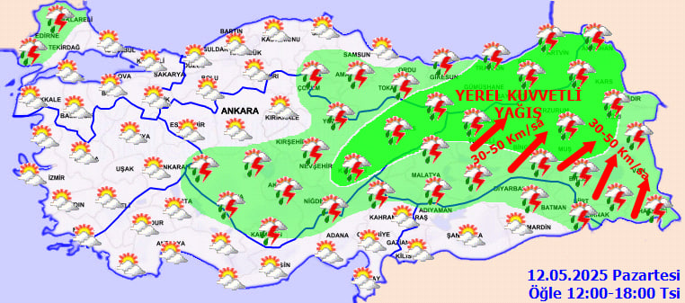 Meteoroloji Genel Müdürlüğü, bazı illerde etkili olması beklenen sağanak yağışlara karşı uyarıda bulundu. Bugün öğle saatlerinden itibaren İç Anadolu'nun doğusu ile Doğu Karadeniz'in iç kesimlerinde yerel olarak kuvvetli sağanak ve gök gürültülü sağanak bekleniyor.