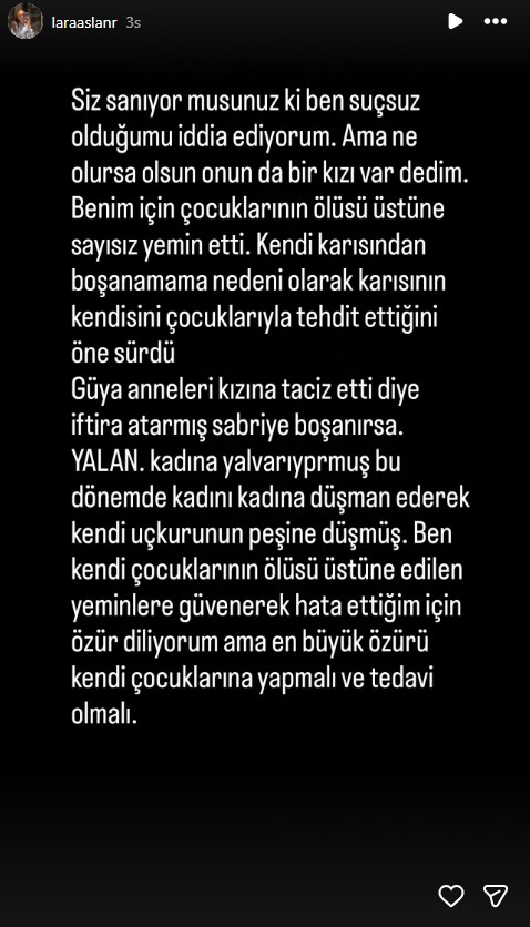 Sabri Sarıoğlu'ndan hamile kaldığını belirten Lara Aslan, "Bana bulaştırdığın hastalığın ceremesini çekerken demediğini bırakmadın. Hamileyken şiddet gördüm. Bu yaşadıklarımın en küçüğü olarak kalmış. Tamı tamına 4 yıl hayatımdan, sağlığımdan çalınan 4 yıl. Bana hâlâ 30 bin dolardan fazla borcu var. Kendi karısına beni kötü olarak, bana da karısını 'kötü hasta' olarak gösteren gerçek bir hastadan bahsediyoruz." dedi.