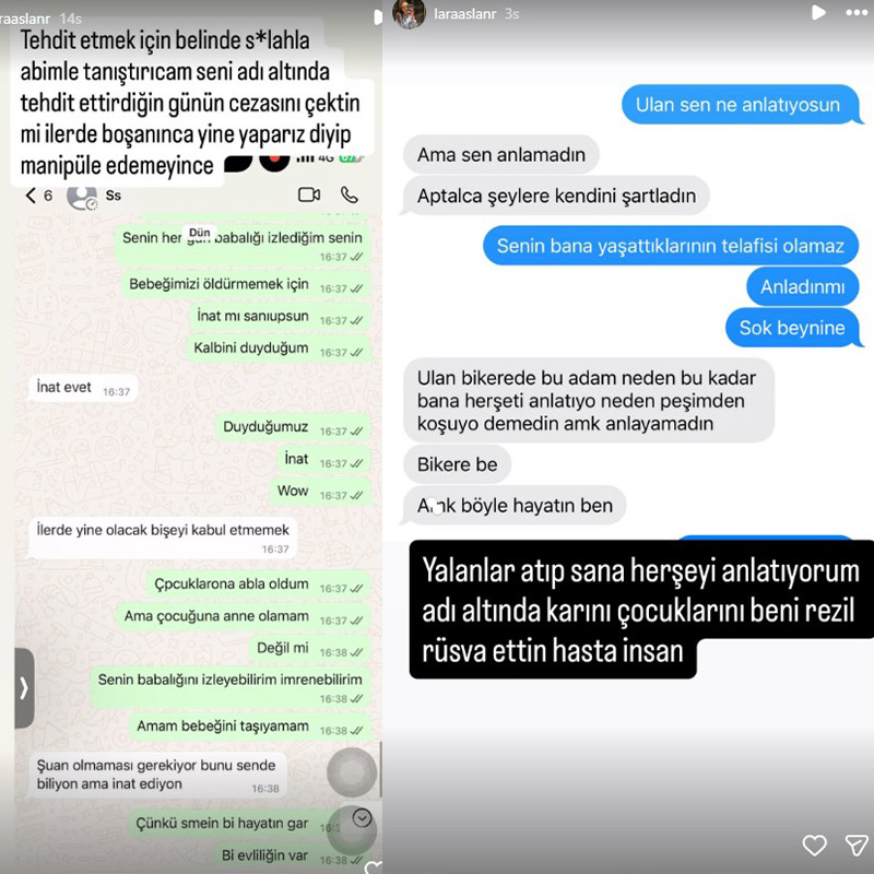 Instagram'dan mesajlaşmaları paylaşan Aslan, "İki kadını da hem fiziksel hem psikolojik olarak hasta etti. Bu hikayenin en büyük suçlusu erkektir. Sayın Sabri Sarıoğlu en kısa zamanda çocuklarının hayatını karartmadan tedavi ol." ifadelerini kullandı.