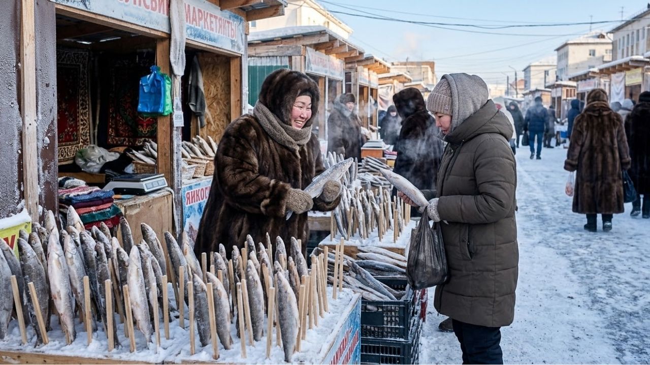 300 binden fazla nüfusa sahip Yakutsk, dünyanın en soğuk büyük şehirlerinden biri. 1891 tarihinde en düşük sıcaklık -64,4 derece olarak ölçüldü. Donmuş zemin üzerine kurulu olan şehirde beslenme alışkanlıkları yüksek kalorili et ve balık ağırlıklı. Açık pazarlarda balıklar donmuş halde dik şekilde satışa sunuluyor.