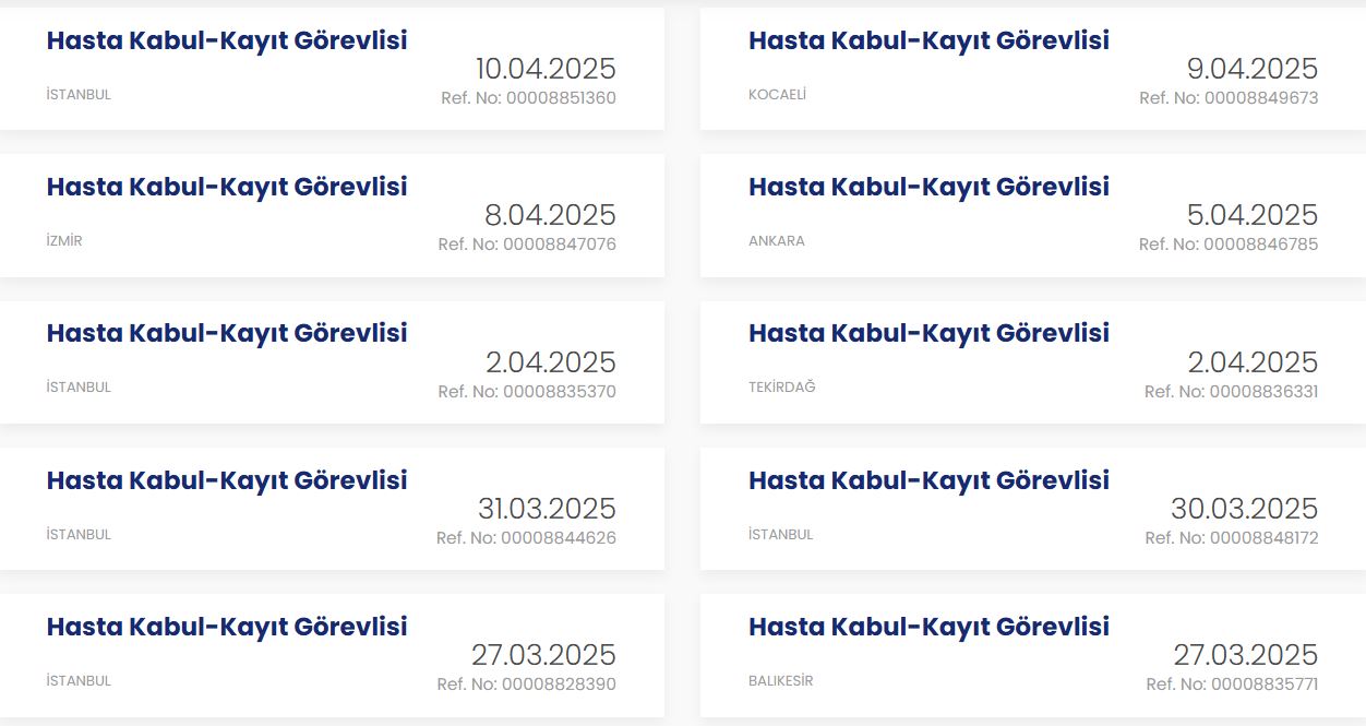 İŞKUR üzerinde hasta kayıt-kabul görevlisi alımları başladı. İstanbul, Kocaeli, İzmir, Ankara, Tekirdağ, Balıkesir, Bursa, Tokat şehirlerinde alımlar gerçekleştirilecek. Alım yapılacak hastane ve klinikler İŞKUR ilanlarında yer alıyor. Başvuru tarihleri şehirden şehire, kurumdan kuruma farklılık gösteriyor. Başvuru şartları ve tarihleri ilanların detaylarında belirtiliyor.