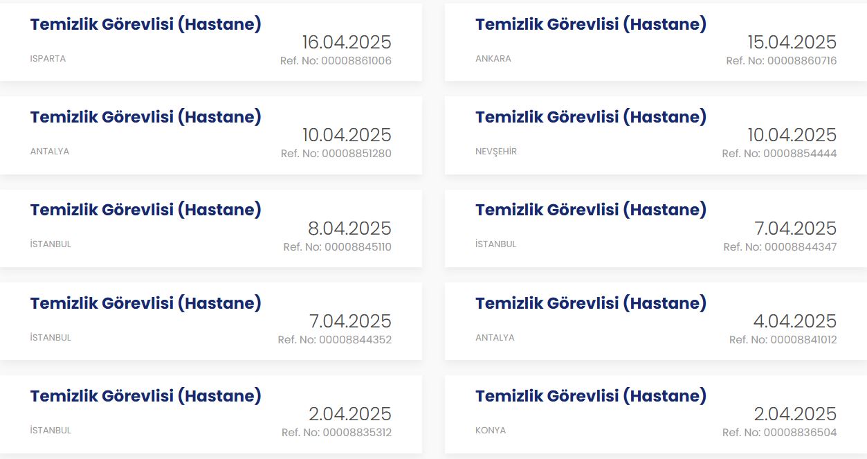Ankara, Antalya, Isparta, İstanbul, İzmir, Nevşehir, Konya şehirlerinde hastanelere alınmak üzere temizlik personeli ilanları yayınlandı. Başvurular 25 Mart - 30 Nisan 2025 tarihleri arasında kabul ediliyor. Başvuru tarihleri kurumdan kuruma değişiklik gösteriyor. Adayların son başvuru tarihlerini kaçırmaması için ilanın detaylarını dikkatlice incelemeleri gerekiyor.