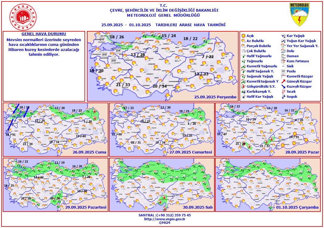 26 Eylül Cuma günü çok bulutlu ve aralıklı yağmurlu bir hava beklenirken, 27 Eylül Cumartesi yerel yağışlar görülecek. 28 Eylül Pazar günü çok bulutlu ve aralıklı yağmur geçişleri bekleniyor. 29 Eylül Pazartesi günü yağışın kesilmesi ve parçalı bulutlu gökyüzü öngörülüyor.
