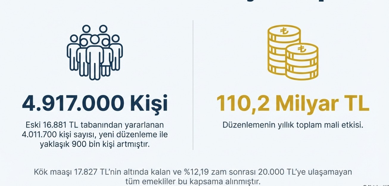 Daha önce en düşük emekli maaşı olan 16 bin 881 liradan yaklaşık 4 milyon 11 bin 700 kişi yararlanıyordu. Yeni düzenleme ile bu sayının 4 milyon 917 bine yükseldiği açıklandı. Yapılan artışın yıllık mali etkisinin ise toplam 110,2 milyar lira olacağı belirtildi.