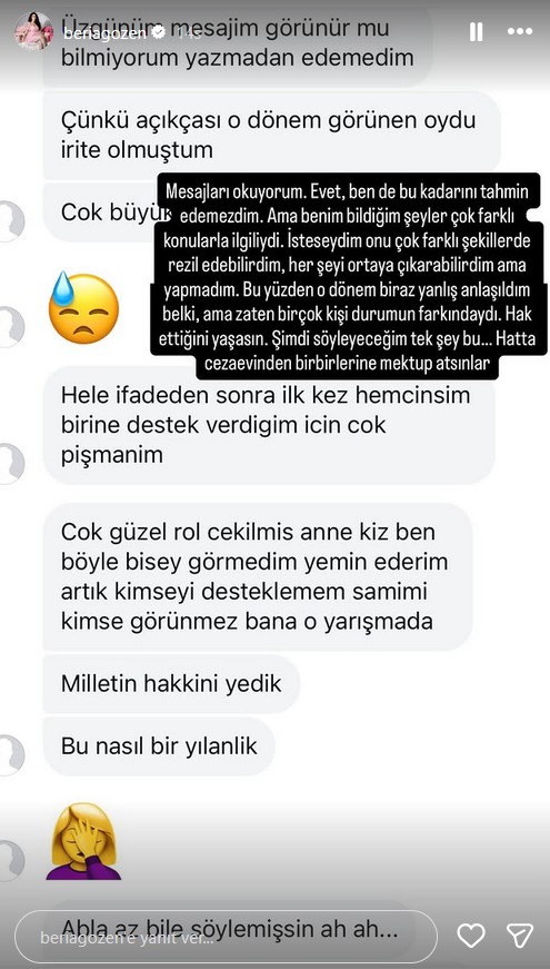 "Mesajları okuyorum. Evet, ben de bu kadarını tahmin edemezdim. Ama benim bildiğim şeyler çok farklı konularla ilgiliydi. İsteseydim onu çok farklı şekillerde rezil edebilirdim, her şeyi ortaya çıkarabilirdim ama yapmadım. Bu yüzden o dönem biraz yanlış anlaşıldım belki, ama zaten birçok kişi durumun farkındaydı. Hak ettiğini yaşasın. Şimdi söyleyeceğim tek şey bu... Hatta cezaevinden birbirlerine mektup atsınlar."