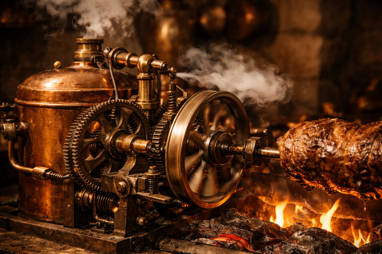 Takiyüddin, "Ruhani Makinelerin Yüce Yöntemleri" adlı eserinde ateş üzerinde kendi kendine dönen bir şiş sistemi tarif etti. Sistemin çalışma prensibi sade ve net bir şekilde yer alıyor: