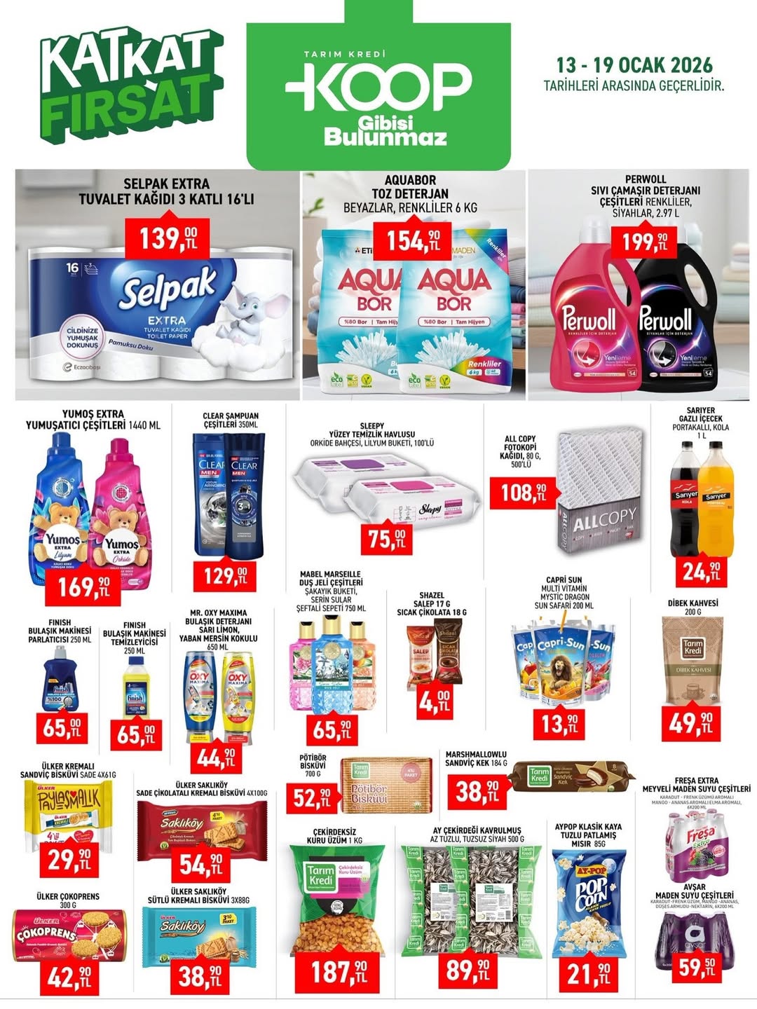 Tarım Kredi KOOP Çiftçi Marketleri'nin 13-19 Ocak 2026 tarihleri arasında geçerli aktüel kataloğu yayımlandı. Temel gıda, temizlik, kişisel bakım ve ev ihtiyaçlarında haftalık indirimler sunuluyor. 2 litre ayçiçek yağı 185 TL, 1 kg tavuk baget 109,90 TL'den satışta.